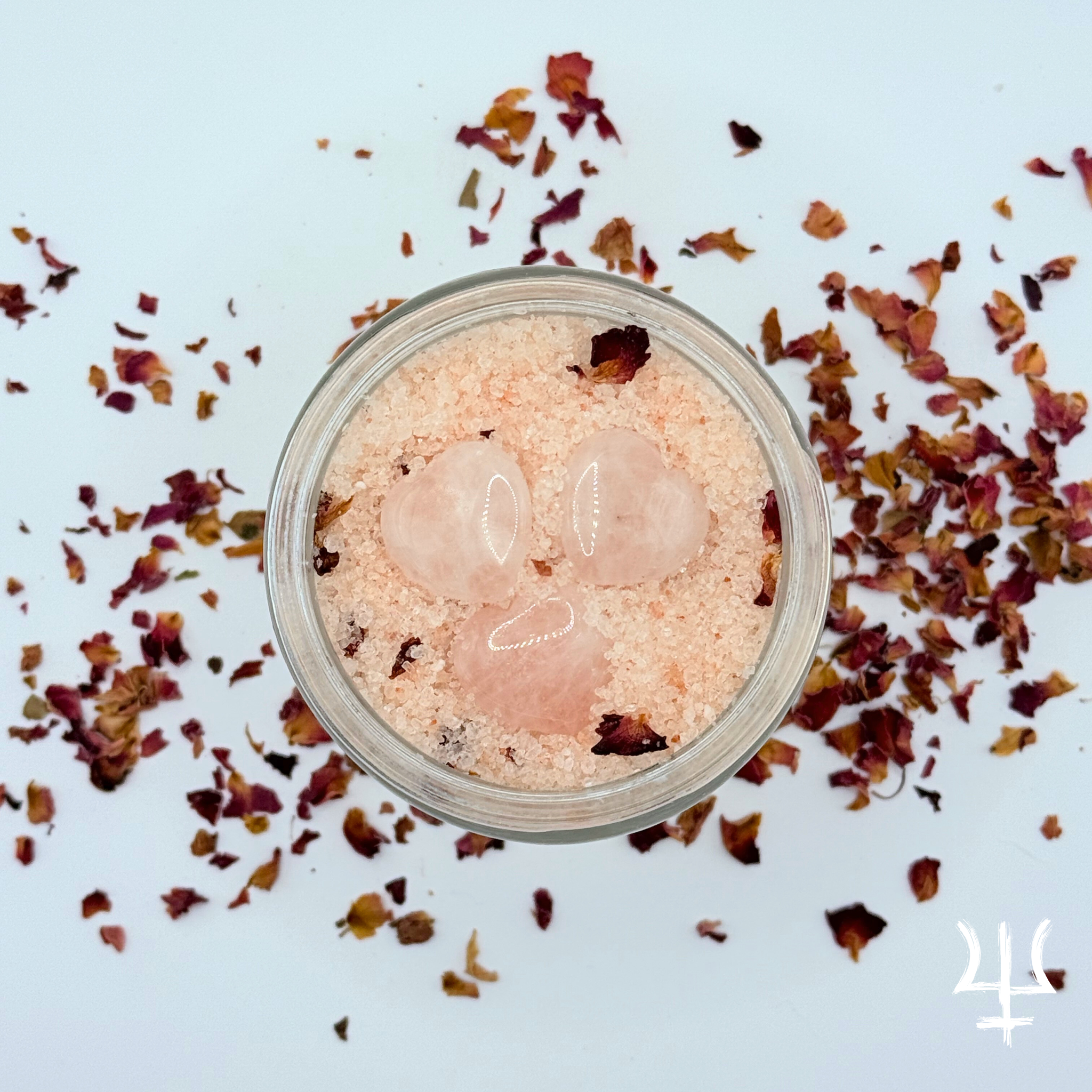 Ingredients: Pink Himalayan Salt, Rose and Vanilla Infused Pumpkin Seed Oil, Organic Jojoba Oil, Organic Dried Rose Petals, Essential Oil Blend. Add-ins: Freeze Dried Organic Pink Rose Petals, Rose Quarts Hearts.